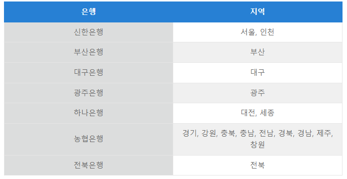지역채권은행은 지자체 주민들이 지방세를 납입할 때 주로 거래하는 은행으로 보통 일정 기간 동안 특정은행에서 위탁을 하기 때문에 자동차를 구매한 지역에 따라 환급받을 수 있는 은행이 다릅니다. 지역별 은행은 아래 표를 참고해주시길 바랍니다.