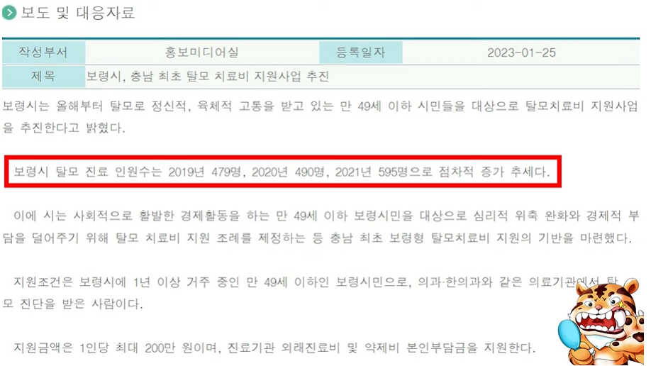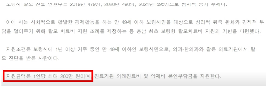 2019년에는 479명에서 2021년에는 595명으로 계속 증가 하고 있기때문에 만 49세이하 보령시민 탈모 치료비를지원하겠다고 보도했습니다.