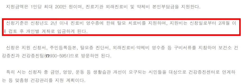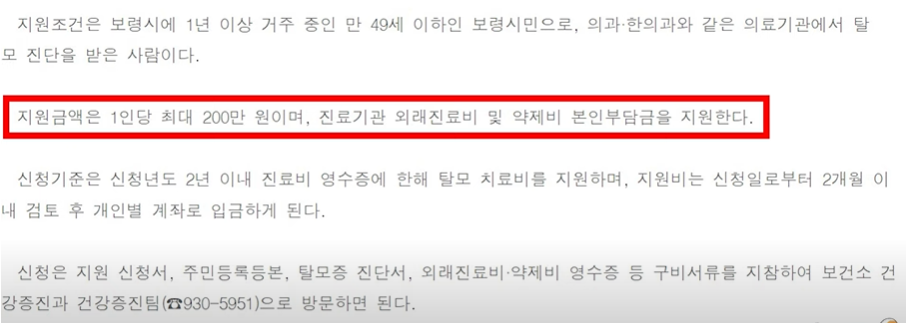 신청하게되면 2년 이내 진료비 영수증에 대해서 치료비를 지원해 주고 있다는데요 신청하게 되면 두 달 안에 검토 후 계좌에 현금으로 바로 입금해 드린다고 하니 충남 보령에 거주하는 탈모 환자 입장에서는 여러 가지 경제적 도움을 받을 수 있다고 하죠
