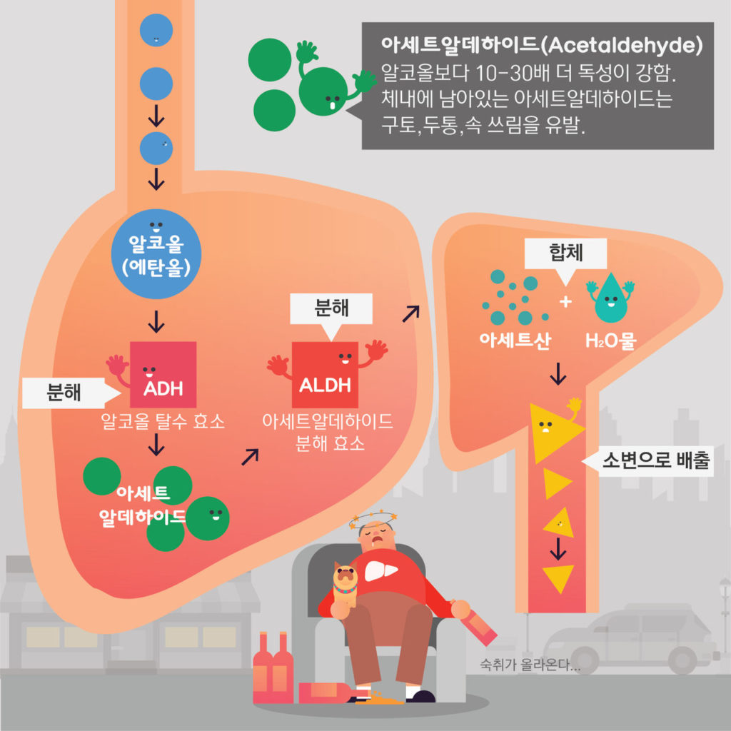 숙취가 생기는 이유는 알코올이 체내에 들어오면서 TCA사이클이 돌아 알코올이 알데하이드로 변하게 되는데요. 알데하이드 성분이 우리 몸에 독성을 줍니다. 알데하이드는 저혈당을 유발하고 젖산을 축적하게 되는데요. 특히 두통을 크게 유발합니다.