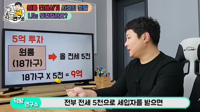 그러면 18가구 원룸을 전부 전세 5천으로 세입자를 받게 되면 큰 돈이 들어오게 되고 계속 원룸을 매입하게 되면서 돈을 빌리고 그러는 동안 계약기간이 끝나 전세금을 돌려 못받은 세입자는 하나둘씩 늘어나게 되고 목표했던 금액을 다 챙기고 난 뒤 원룸 시세가 오를 줄 알고 갭투자를 하엿는데 실패를 했다 보증금을 내줄 돈이 없다면서 사기를 치게 됩니다.