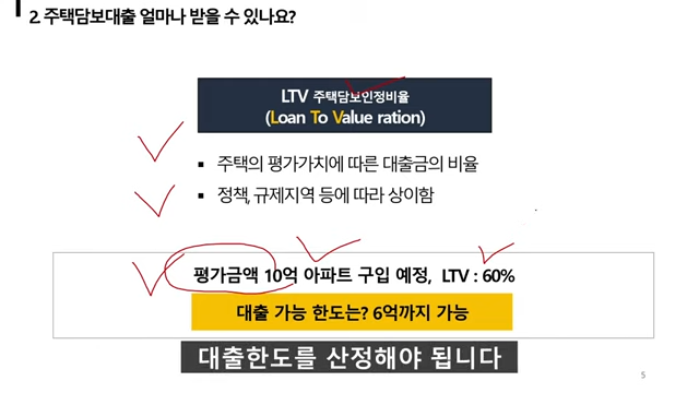 LTV는 부동산 정책이나 규제지역에 따라 한도가 달라지기 때문에 구입하려는 지역의 상황을 잘 살피셔야 합니다. 예를들어 10억의 집의 LTV가 60%라면 최대 6억 까지 대출을 받으실 수 있습니다.