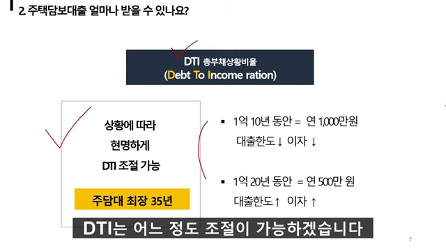 즉 상황에 따라 현명하게 DTI를 조절할 수 있는데요. 주담대는 최장 35년까지 가능한데 상환 기간이 길면 매년 갚는 금액이 줄어드니깐 더 많은 금액의 대출을 받을 수 있다는 소리입니다. 금리가 낮은 경우엔 매년 갚는 이자가 줄어들게 되어 더 많은 금액의 대출을 받으실 수 있습니다.