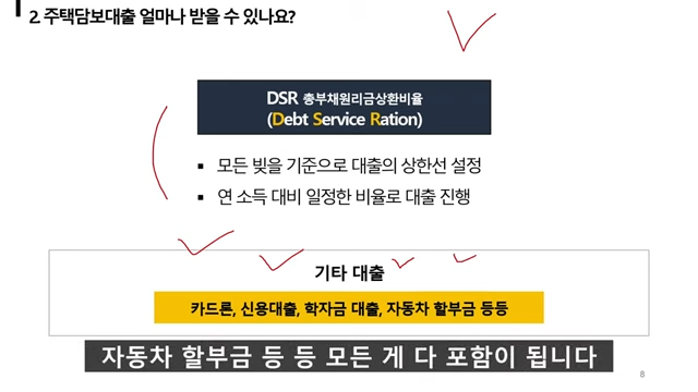 DSR은 총부채원리금상환비율이란 뜻으로 내가 진 모든 빚을 조사한 뒤 대출을 해주겠다는 소리입니다. 카드론, 신용대출, 학자금 대출, 자동차 할부금 등 모든 대출이 포함이 됩니다. DSR이 높은 경우엔 대출이 불가능 하니 네이버 DSR 계산기를 통해 정확하게 계산을 해보시길 바랍니다.