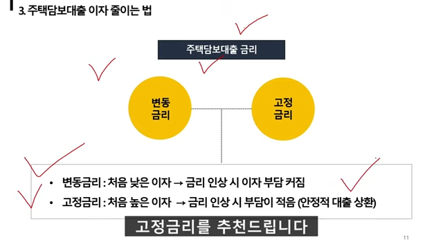 이제 주택담보대출 이자 줄이는 방법에 대해 알려드리도록 하겠습니다. 첫번째로 주택담보 대출의 금리를 살펴보셔야 하는데요. 금리에는 크게 변동금리와 고정금리로 나뉘게 됩니다.