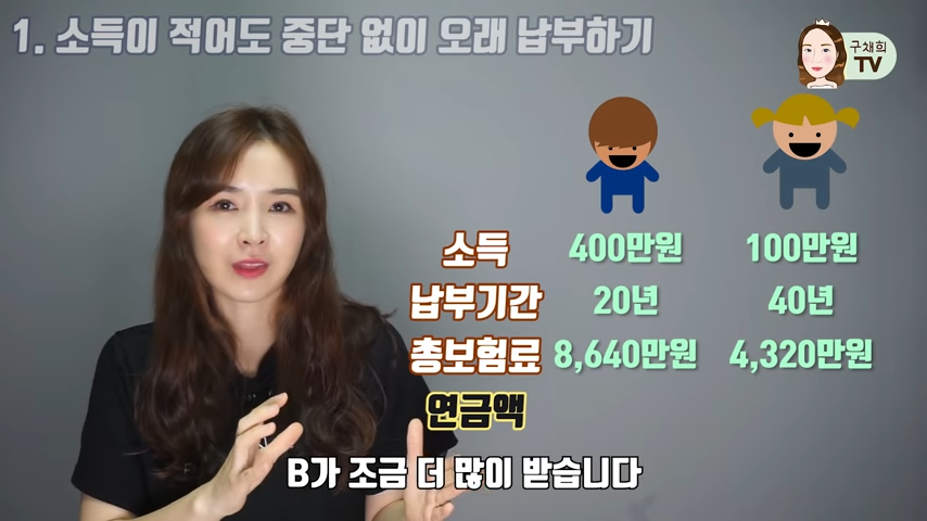 소득이 400만원인 A와 소득이 100만원인 B가 있습니다. A는 납부를 20년동안 하였고 B는 납부를 40년 동안 하엿는데요. A는 총보험료가 8,640만원 B는 총보험료가 4,320만원입니다. 당연히 A가 연금을 더 많이 받을 것 같지만 놀랍게도 B가 연금을 A 보다 조금 더 많이 받습니다.