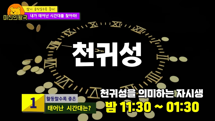 밤 11시 30분 ~ 새벽 1시 30분에 태어난 분들을 천귀성에 태어났다고 하는데요. 천귀성은 귀함, 지혜를 뜻합니다. 평생 지혜롭게 살수 있고 말년에 복이 있기 때문에 사람이 행동을 적극적으로 하면 반드시 기회를 많이 잡을 수 있습니다.