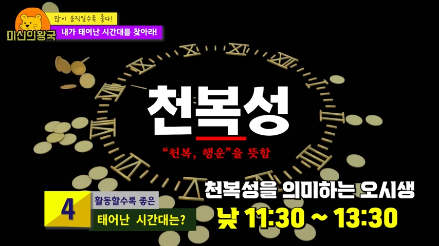 천복성을 의미하는 11시 30분 ~ 13시 30분에 태어난 오시생분들은 남들에 비해 성취가 빠른 편이며 나를 아껴주는 분들이 많다고 할 수 있습니다.