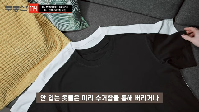 오랜 기간 한 곳에서 살다 보면 불필요한 짐들이 늘어나기 마련입니다. 미리 필요 없는 짐들을 정리하여 불필요한 비용을 줄일 수 있도록 합니다. 안입는 옷들은 미리 수거함을 통해 버리거나 헌 옷 수거 서비스를 이용하시면 됩니다.