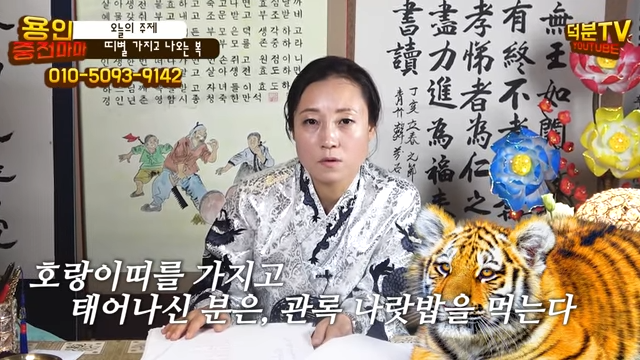 다음은 호랑이띠입니다. 호랑이띠의 경우는 강하다고 합니다. 산신 할아버지 달에 태어났다고 하는데요. 그래서 호랑이띠를 가지고 태어나신 분은 관록, 나랏밥을 먹는다고 합니다. 나랏밥을 먹는다는 것은 그만큼 공부를 많이 하고 집중력도 좋다고 하는데요.
