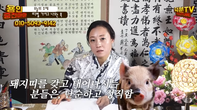 다음은 돼지띠입니다. 돼지띠를 갖고 태어나신 분들은 단순하고 정직하고 꿈에 돼지 나오면 로또를 사러 가듯 재물이 따라준다고 합니다. 그리고 마음이 되게 여리고 식복, 재물복 등 여러 가지 복을 가지고 있다고 생각하시면 될 것 같습니다.