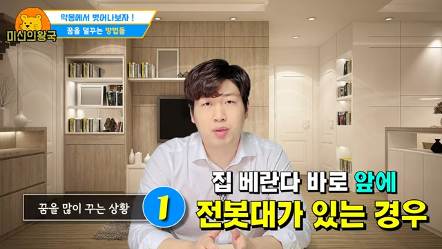 꿈을 많이 꾸는 분들의 특징은 본인의 기운과 맞지 않는 집에 거주할 때입니다. 꿈을 많이 꾸는 상황 첫 번째는 집 베란다 바로 앞에 전봇대가 있는 경우입니다.