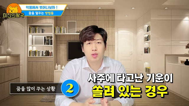 꿈을 많이 꾸는 분들의 특징 두 번째는 사주에 타고난 기운이 쏠려 있는 경우입니다. 기운이 몰렸다는 것은 본인 사주에 토기운, 화기운, 수기운이 많을 경우 꿈을 많이 꿉니다. 그 외에도 편관대운이라든지 편관의 기운이 많다든지 관살이 혼잡된 그런 분들도 악몽을 자주 꾸시거나 가위에 눌렸던 경험이 많다고 합니다.