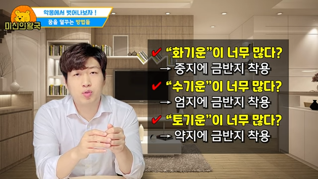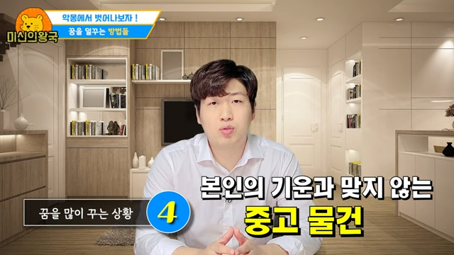 꿈을 많이 꾸는 분들의 특징 네 번째는 본인의 기운과 맞지 않는 중고 물건입니다. 집안에 중고 물건이 들어오거나 어떤 물건이 갑자기 들어왔을 때 꿈을 많이 꿨다면 그 물건을 치우시고 꿈을 많이 안 꾸시던 분들이 특정 시점부터 꿈을 꾸기 시작했다면 어떤 물건의 영향 때문일 수도 있으니 그 물건을 찾아 치우시기 바랍니다.