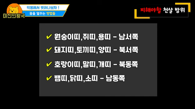 원숭이띠, 쥐띠, 용띠는 남서쪽 / 돼지띠, 토끼띠, 양띠는 북서쪽 / 호랑이띠, 말띠, 개띠는 북동쪽 / 뱀띠, 닭띠, 소띠는 남동쪽입니다. 이것을 참고하시고 확인해 보시길 바랍니다.