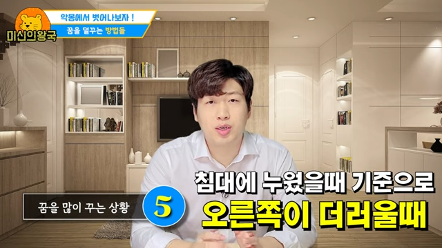 꿈을 많이 꾸는 분들의 특징 다섯 번째는 침대에 누웠을 때 기준으로 오른쪽이 더러울 때입니다. 본인의 침실을 기준을 왼쪽이 청룡의 위치여서 지저분해도 상관없고 우측은 백호의 위치여서 굉장히 깔끔해야 됩니다. 본인이 주무시는 침실을 기준으로 오른쪽이 지저분하고 어떤 뾰족한 물건이라든지 자면서 보이면 안 되는 물건들이 보인다면 굉장히 흉하기 때문에 침실의 오른쪽은 반드시 깨끗이 치워야 합니다.