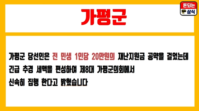 다음은 가평군입니다. 가평군 당선인은 전 민생 1인당 20만원의 재난지원금 공약을 걸었는데 긴급 추경 세액을 편성하여 제 8대 가평군 의회에서 신속히 집행 한다고 밝혔습니다.