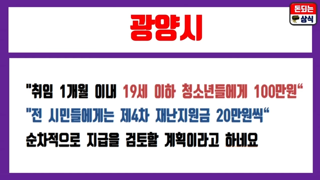 다음은 광양시입니다. 이번 지방선거 당선인이 “전 시민에 재난지원금을 지급할 것이며 취임 직후 신속히 집행 하겠다”라고 밝혔습니다. “취임 1개월 이내 19세 이하 청소년들에게 100만원” “전 시민들에게는 제 4차 재난지원금 20만원씩” 순차적으로 지급을 검토할 계획이라고 합니다.
