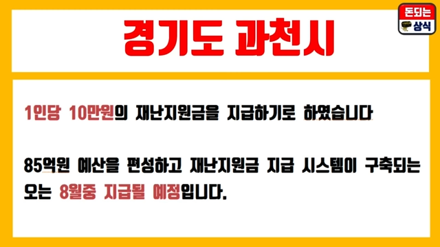 다음은 경기도 과천시입니다. 1인당 10만원의 재난지원금을 지급하기로 했습니다. 85억원 예산을 편성하고 재난지원금 지급 시스템이 구축되는 오늘 8월 중 지급될 예정입니다.