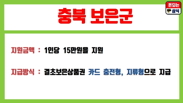 다음은 충북 보은군입니다. 지원대상은 2022. 01. 01 기준 세대별 주민등록표를 적용하고 신천일 현재까지 보은군에 주민등록을 두고 있는 사람에게 지급되고 있습니다. 외국인 중 영주권자(F5) 및 결혼이민자(F6)도 지급대상에 포함 됩니다. 지원금액은 1인당 15만원을 지원합니다. 지급방식은 결초보은상품권 카드 충전형, 지류형으로 지급됩니다. 신청기간은 22. 06. 13. (월) ~ 06. 17. (금) (1주간) / 상품권 카드 충전형으로 지급되고 22. 06. 20. (월) ~ 07. 15. (금) (4주간) / 상품권 지류형으로 지급됩니다. 신천은 거주지 행정복지센터 방문 신청 하시면 됩니다.