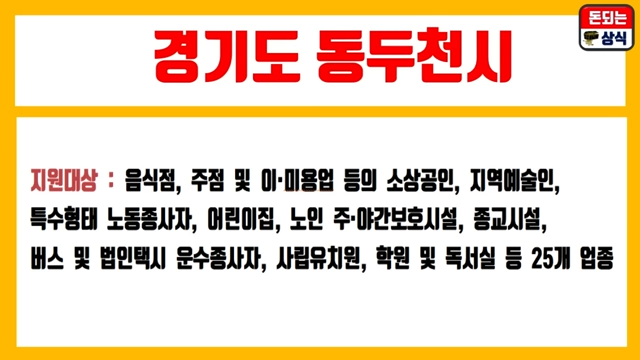 다음은 경기도 동두천시입니다. 코로나로 인한 영업제한 및 집합 제한으로 어려움을 겪고 있는 소상공인 및 특수형태 근로종사자 등에게 재난특별지원금을 지원합니다. 지원대상은 음식점, 주점 및 이-미용업 등의 소상공인, 지역예술인, 특수형태 노동종사자, 어린이집, 노인 주-야간 보호시설, 종교시설, 버스 및 법인택시 운수종사자, 사립유치원, 학원 및 도서실 등 25개 업종이 해당됩니다. 업종에 따라 50만원 ~ 150만원까지 지역화폐로 지급됩니다. 신청방법은 6월 7일부터 동두천시청 홈페이지에서 온라인 접수가 가능합니다.