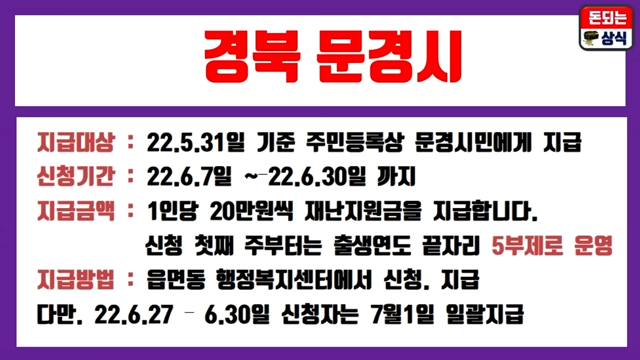 다음은 경북 문경시입니다. 지급대상은 22.05.31일 기준 주민등록상 문경시민에게 지급되고 신청기간은 22.06.07일 ~ 22.06.30일 까지입니다. 지급금액은 1인당 20만원씩 재난지원금을 지급합니다. 신청 첫째 주부터는 출생연도 끝자리 5부제로 운영됩니다. 지급방법은 읍면동 행정복지센터에서 신청 후 지급됩니다. 다만, 22.06.27 ~ 06.30일 신청자는 7월 1일 일괄지급합니다. 지급방식은 문경사랑상품권으로 지급합니다.