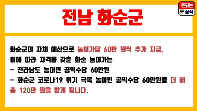 다음은 전남 화순군입니다. 화순군이 자체 예산으로 농어가당 60만원씩 추가 지급합니다. 이에 따라 자격을 갖춘 화순 농어가는 전라남도 농어민 공익수당 60만원 + 화순군 코로나19 위기 극복 농어민 공익수당 60만원을 더 해 총 120만원을 받게 됩니다. 8월30일까지 지급할 예정입니다.