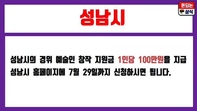 다음은 성남시입니다. 성남시의 경위 예술인 창작 지원금 1인당 100만원을 지급합니다. 성남시 홈페이지에 7월 29일까지 신청하시면 됩니다.