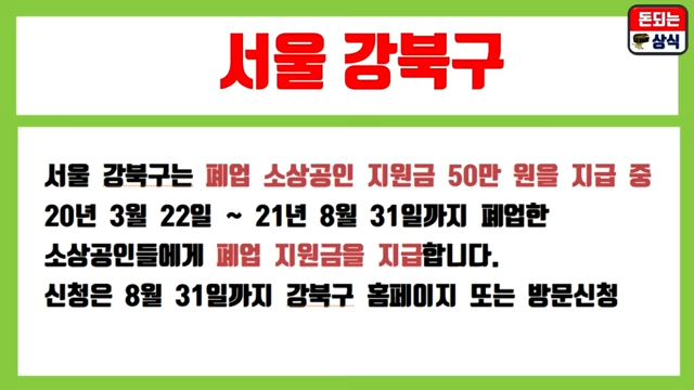 다음은 서울 강북구입니다. 서울 강북구는 폐업 소상공인 지원금 50만원을 지급 중입니다. 20년 3월 22일 ~ 21년 8월 31일까지 폐업한 소상공인들에게 폐업 지원금을 지급합니다. 신청은 8월 31일까지 강북구 홈페이지 또는 방문신청을 하시면 됩니다.