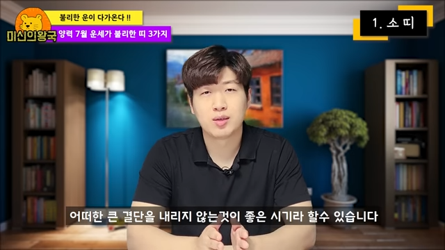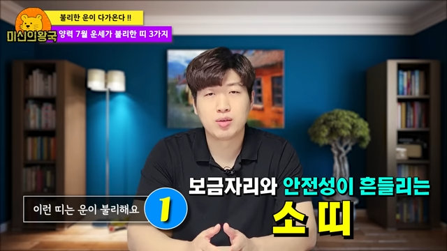조심해야 하는 띠 첫 번째는 보금자리와 안정성이 흔들리는 소띠입니다. 소띠분들은 특히 음주를 조심하셔야 합니다. 사주에는 다양한 것들이 있는데 그중에서 축미충이라는 것이 정말 안 좋게 작용하는 요소가 있습니다. 그래서 양력 7월은 본인이 원하든 원하지 않든 주거지에 변동이 강하게 들어올 수 있습니다.