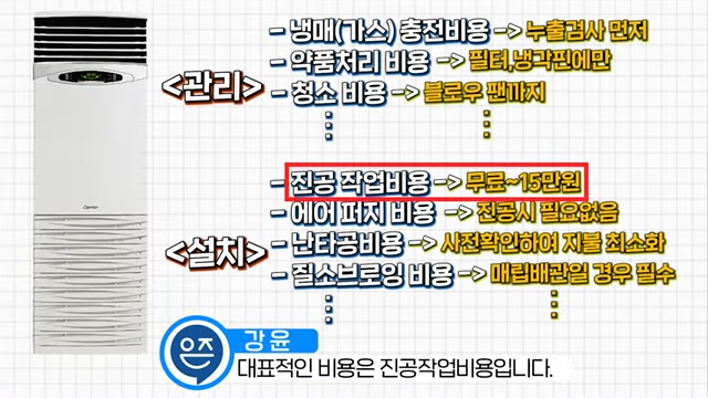 냉매 충전 이외에도 미리 확인해야 하는 에어컨 설치비용이 많습니다. 대표적인 비용은 진공 작업 비용입니다. 진공 작업은 냉매관 내무의 불필요한 공기를 빼주기 때문에 반드시 필요한 작업입니다. 보통 전자랜드나 하이마트 같은 오프라인에서 구매하는 경우에는 무료로 서비스 해 주지만 온라인에서 구매했을 경우 5만원에서 15만원까지 받는 경우가 있습니다.