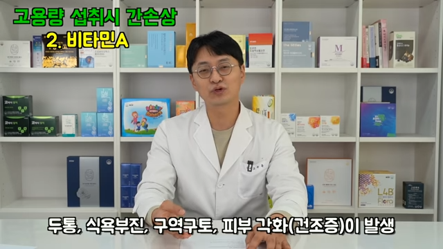2. 비타민 A입니다. 보통 흡연자는 5000단위 이하 비흡연자는 10000단위 이하는 전혀 문제가 없습니다. 매일 4만 단위 이상 섭취 시 간 독성이 발생했다고 합니다. 대부분의 간 독성 사례들은 수십만 단위로 기본 권장량의 수십 배~수백 배 이상 섭취했을 때 간 독성이 발생합니다.