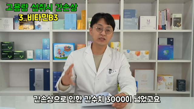 3. 비타민 B3입니다. 비타민 B3를 고용량 섭취하는 이유는 보통 고지혈증 개선 목적이 많습니다. 일반적인 나이아신 100mg~200mg은 문제가 되지 않고 500~1000mg 이상 그리고 지속 방출형(서방형)으로 섭취했을 때 문제가 발생되었습니다. 비타민 B3는 간 손상 잠복기가 아주 긴 편이라서 확인이 어려울 수 있습니다. 전형적인 증상인 황달, 구역, 구토, 식욕부진, 간세포 비대화 등이 발생했고 간 수치는 3000이 넘은 경우도 있습니다. 고지혈증 치료 목적으로 드시는 분들이 많기 때문에 주의해서 드실 필요가 있습니다.