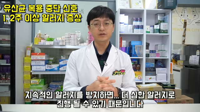 일시적인 알러지 반응은 유산균 복용 초기에 흔하게 발생합니다. 다만 지속적이고 광범위한 알러지는 주의가 필요합니다. 알러지 증상으론 온몸이 가렵고 붓기도 하고 홍조, 두드러기가 생길 수 있습니다. 보통은 3~7일 정도 먹다 보면 없어지는 것이 대부분이지만 2주 이상 지속된다면 곧바로 중단해야 합니다. 심한 경우 기도가 부어서 호흡곤란이 올 수도 있고 최악의 경우 아나필락시스 쇼크 등이 있겠습니다.