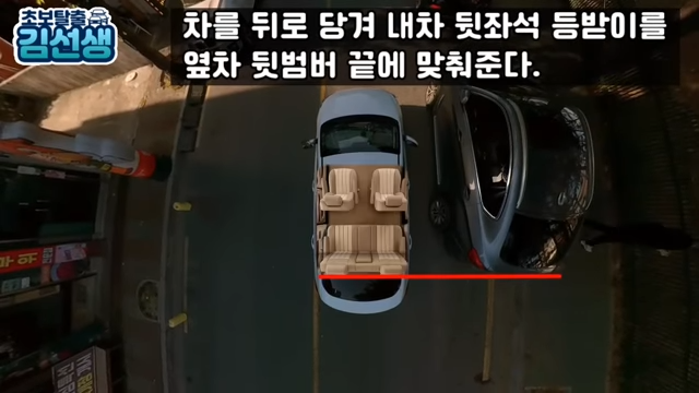 4. 내 차 사이드 미러와 앞 차의 뒤 범퍼가 일직선상에 놓일 때까지 후진하기