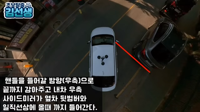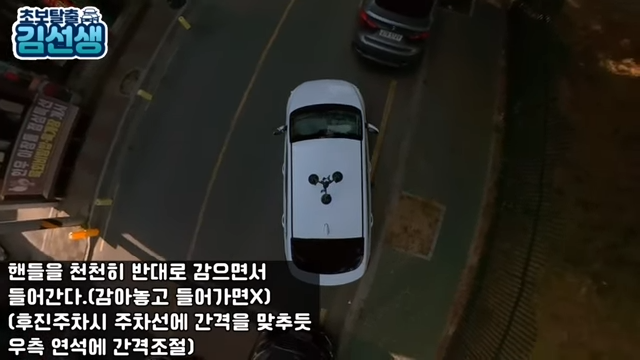 이 과정에서 의문점이 들 부분이 있을 수 있습니다. 자리로 들어갈 때 미리 반대로 핸들을 감지 않고 풀면서 들어가는지입니다. 이 이유는 미리 다 반대로 돌려놓고 들어가게 되면 내 앞범퍼와 앞 차 뒤 범퍼와 부딪힐 가능성이 있고 안 부딪히고 들어가도 벽 면과 거리가 멀어져서 수정을 많이 해야 합니다.