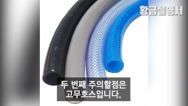두번째 고무호스입니다 최근 상수도사업소에 수돗물에서 역한 냄새가 나서 애써 담근 김치를 다 버리게 되었다는 항의 전화가 빗발치는 일이 있어다고 합니다. 하지만 그역한 냄새의 원인은 수돗물이 아닌 고무호스에 있습니다. 수돗물 속에는 정수하는 과정중 세균을 없애주는 염소라는 성분이 들어가게 됩니다.