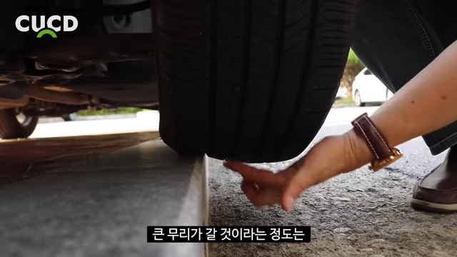 개구리 주차시 타이어의 일부분만이 살짝 걸쳐져 있게 되고 차의 무게 때문에 타이어 표면이 편평하지 못하고 찌그러지게 됩니다. 일반적인 중형사의 공차중량이 1.5톤 전후인 것을 감안하면 차의 구조에 대해 잘 알지 못하더라도 바퀴 쪽에 큰 무리가 갈 것이라는 것을 알 수 있습니다.