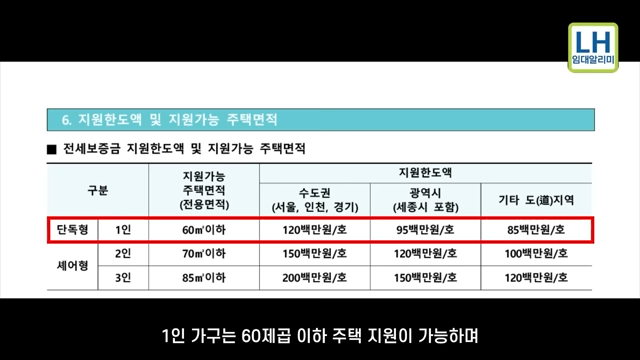 지역과 가구 수에 따라 지원되는 주택과 금액의 조건이 조금씩 다른데요. 1인 가구는 60제곱 이하 주택 지원이 가능하며 최대 1억 2천만원 까지 셰어형 2인의 경우 70제곱 이하 주택 최대 1억 5천만원까지 셰어형 3인의 경우 85제곱 이하 주택 최대 2억원까지 지원을 해줍니다.