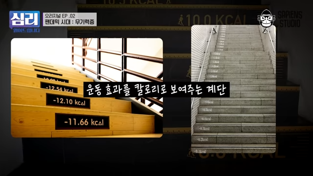 무기력증을 예방하기 위해서는 개인의 노력이 어떤 변화를 만들어 낼 수 있는지 정확한 숫자로 보여주는 것이 중요합니다. 예시로 계단에 운동효과로 인한 칼로리 소모량을 숫자로 볼 수 있도록 표시 해둔 것 나의 작은 노력을 정확하게 의미 있는 것으로 만들어 주는 정보 조금 더 힘을 내서 엘리베이터 보다는 계단을 선택할 의미를 만들어주게 됩니다. 크고 장기적인 목표일수록 오늘 나의 노력을 더 선명하게 만드시길 바라겠습니다.