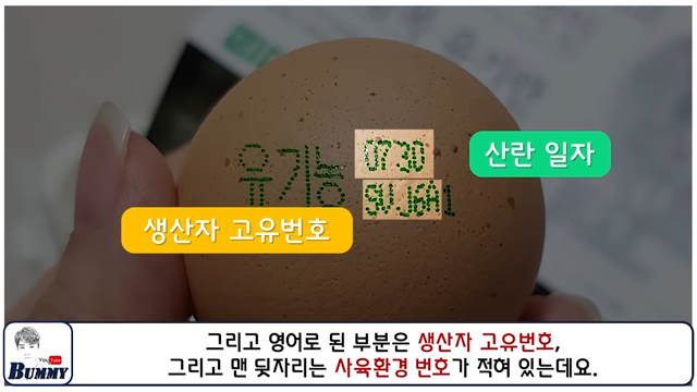 두번째 계란을 자세히 보면 영어와 숫자들이 적힌 걸 볼 수 있습니다. 맨 앞에 있는 숫자는 이 계란이 언제 나왔는지 닭이 알을 낳은 날짜를 알 수 있는 산란일자 표시고 영어로 된 부분은 생산자 고유번호 그리고 맨 뒷 자리는 사육환경 번호가 적혀있습니다.