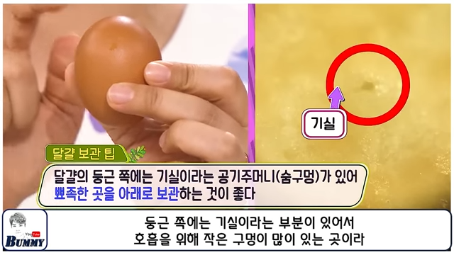 계란을 구입해서 보관할 때 계란을 아무렇게나 넣어서 보관하는 분들이 계시는데 계란을 자세히 보면 아래 부분이 둥글고 윗부분은 뾰족합니다. 둥근 쪽에는 기실이라는 부분이 있어서 호흡을 위해 작은 구멍이 많이 있는 곳이라 그만큼 얇기 때문에 깨지기 쉬워서 세균에 노출될 수 있습니다. 그래서 뾰족한 부분을 아래로 두어야 신선하게 오래 먹을 수 있다고 합니다.