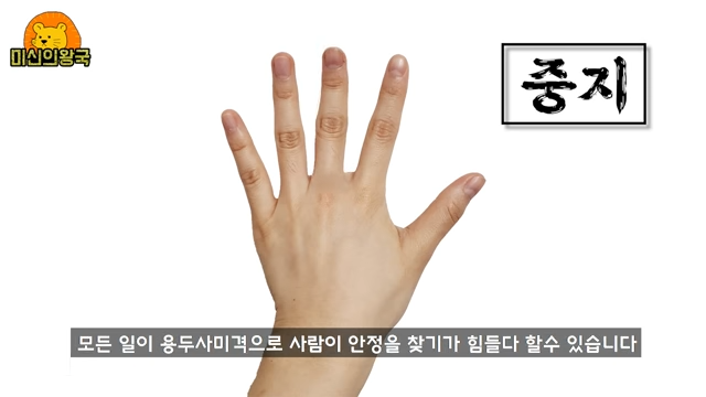 중지가 매우 작은 경우엔 모든 일이 용두사미격으로 사람이 안정을 찾기 힘들다고 할 수 있습니다. 보통 사람의 손가락을 보면 중지가 제일 긴데요. 하지만 중지가 다른 검지와 약지와 비슷하거나 조금 짧거나 딱봐도 중지가 조금 작아보이는 분들의 경우가 해당됩니다. 또한 이런 분들은 배우자로 인해 크게 스트레스 받고 고된 일생을 보낼 수 있습니다.