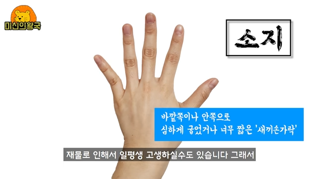 새끼손가락이 바깥쪽으로 심하게 굽었거나 안쪽으로 심하게 굽고 짧은 경우엔 재물로 인하여 일평생을 고생할 수 있습니다. 따라서 손가락을 정리해보면 손가락은 구불구불하지 않고 각자의 방향을 향해 잘 뻗어져 있는 것이 매사에 막힘이 없고 운세에 가장 좋은 손가락이라고 할 수 있습니다.