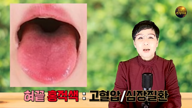 혀끝이 홍적색을 띄면 고혈압이나 심장질환을 의심해 볼 수 있으며 혀 중앙에 두꺼운 누런 설태가 있다면 위염 또는 장염이 생겼을 수 있습니다.