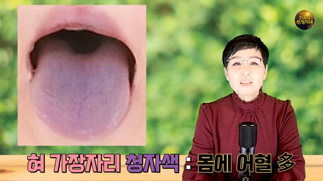 혀 가장자리가 청자색이면 몸에 어혈이 많다는 뜻이고 두꺼운 설태는 간에 영즘이 생겼을 확률이 높다고 합니다. 또한 혀를 쭉 내밀 때 혀를 똑바로 반듯이 내밀지 못하고 비스듬히 내리면 경추에 문제가 있거나 뇌졸증 신호입니다.