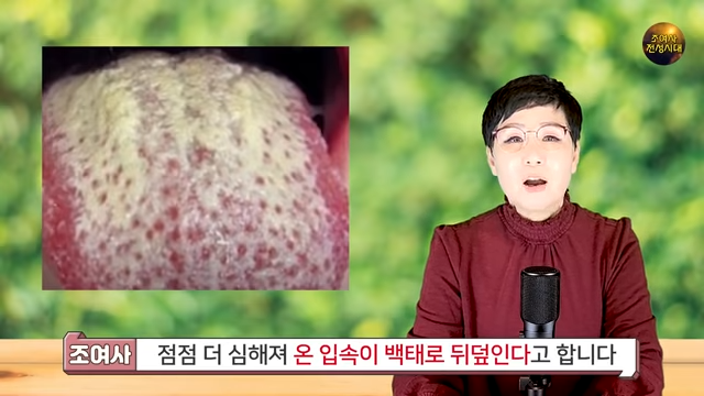 증상은 처음에 백태가 끼다가 점점 더 심해져 온 입속이 백태로 뒤덮인다고 합니다. 구강 칸디다증은 병원에서 약물 치료를 하면서 늘 입속을 청결히 하는건 물론이고 칫솔도 끓는 물에 소독하는 게 중요하다고 합니다. 이렇게 혀만 봐도 몸 어디가 안 좋다는 것을 알 수 있다는 겁니다.