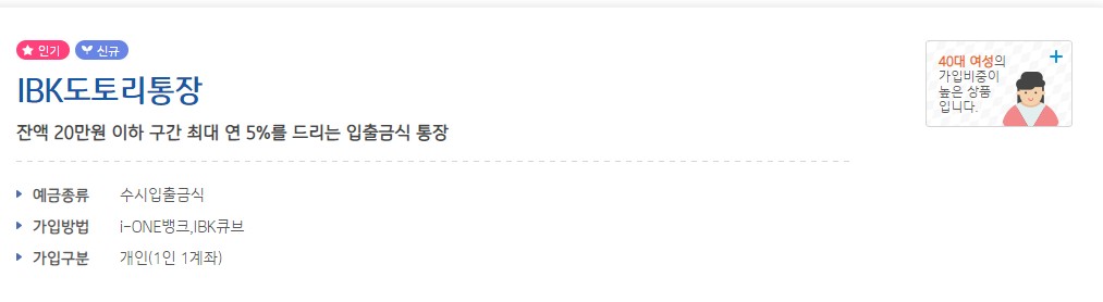 기업은행을 이용하시는 분들은 도토리통장을 추천 드립니다. 금리가 가장 큰 메리트인데 일반적으로 입금하는 돈에 대해서는 다른 통장들과 마찬가지로 연 0.1% 금리를 제공하는데 잔액 20만원에 한해서는 연 5%의 금리를 제공하고 있습니다.