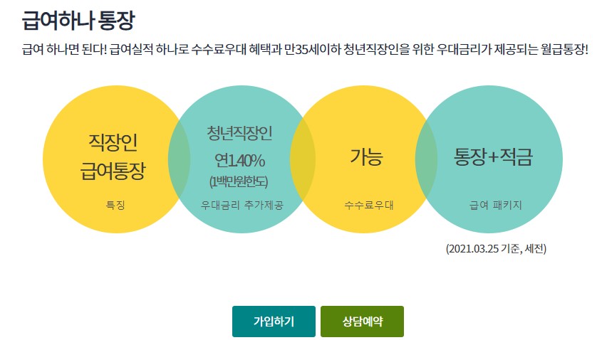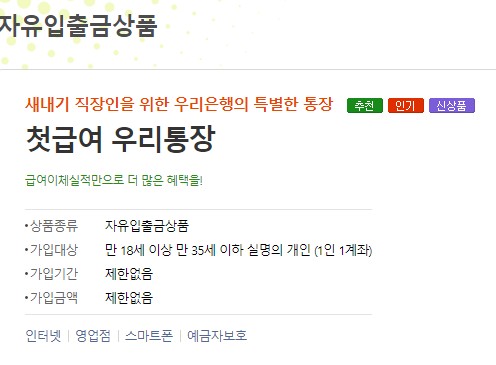 우리은행을 이용하시는 분들은 첫 급여 우리 통장을 추천 드립니다. 나이 제한이 있기는 하지만 나이 제한이 만 18세 이상부터 만 35세 이하의 청년들이 이용할 수 있습니다.