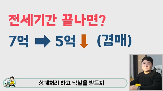 만약 전세기간이 끝났는데 집값이 7억에서 5억으로 떨어진다면 집주인이 여기저기 사채라도 써서 전세금을 돌려주는 것이 아닌 전세금으로 집 소유권을 가져가라고 하는 사람들이 대부분일 텐데 그럼 경매로 넘겨서 보증금을 배당 받거나 세입자가 직접 보증금을 상계처리 하고 낙찰을 받거나 이래저래 세입자만 힘든 시간을 보낼 수밖에 없습니다.
